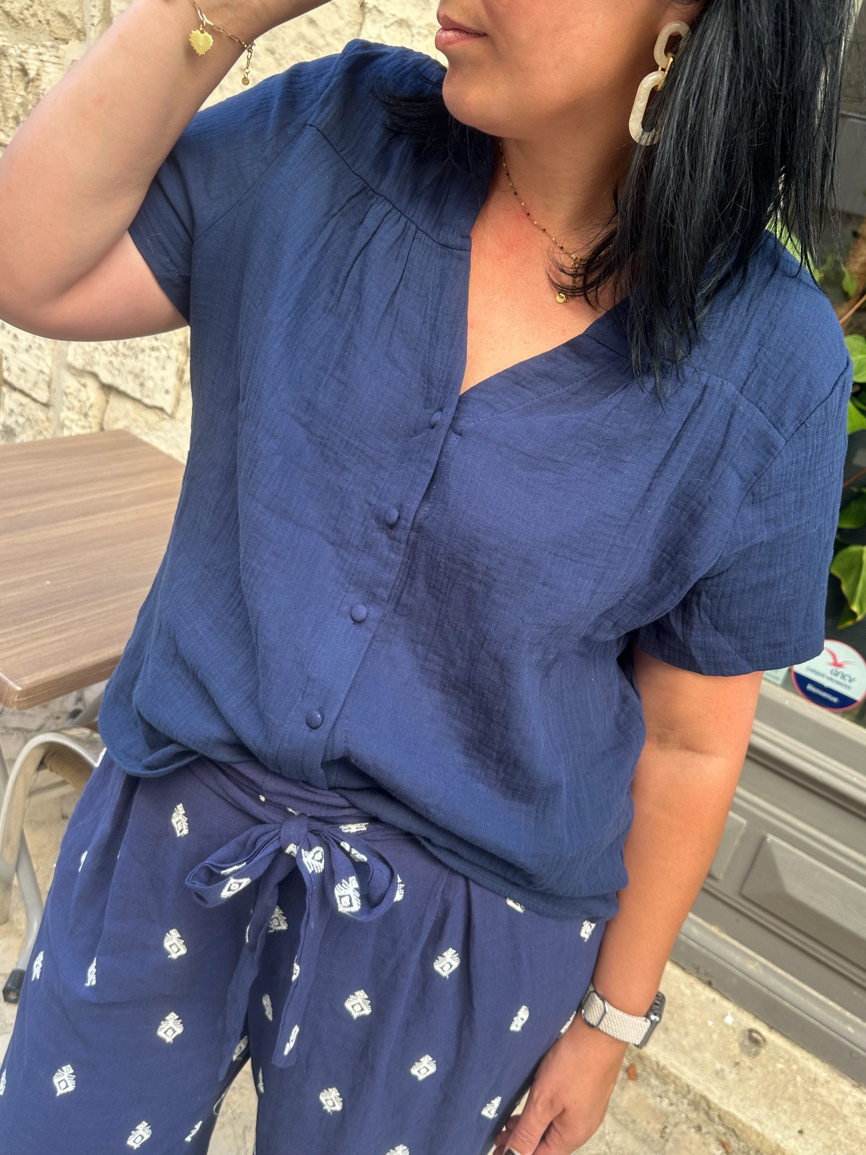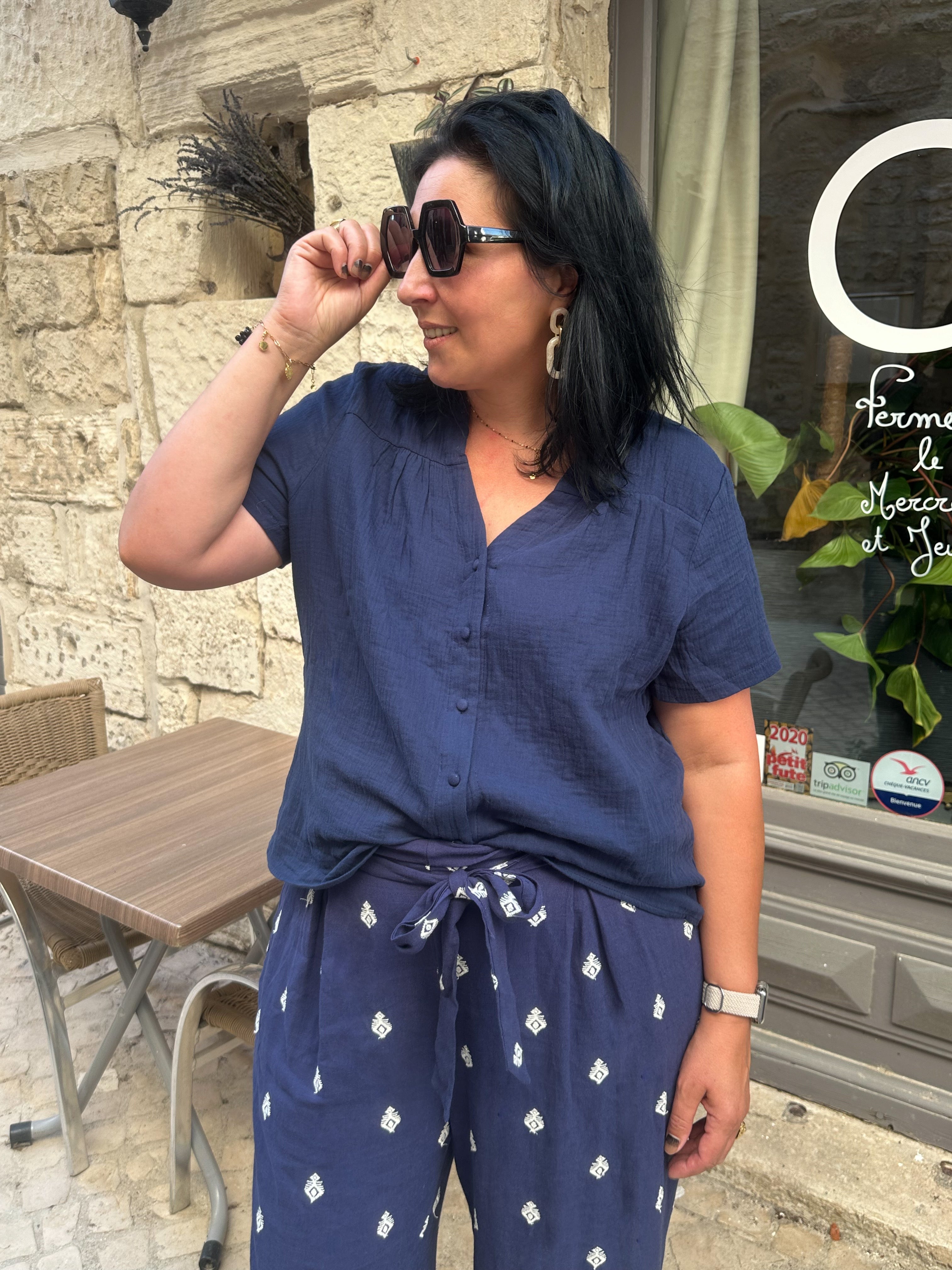 Le mannequin mesure 1m80. Elle porte une taille 44 pour le haut et une taille 48 pour le bas.