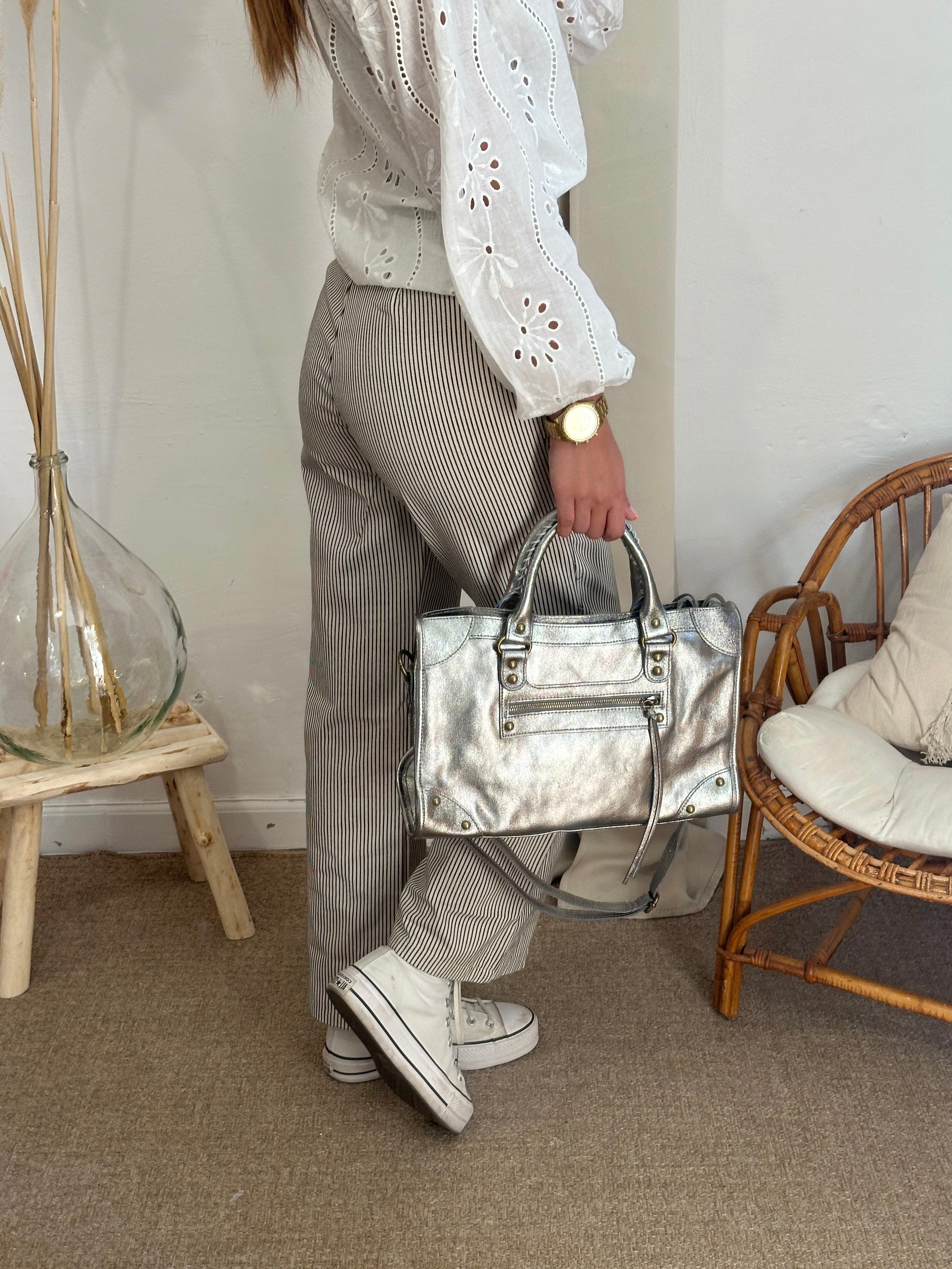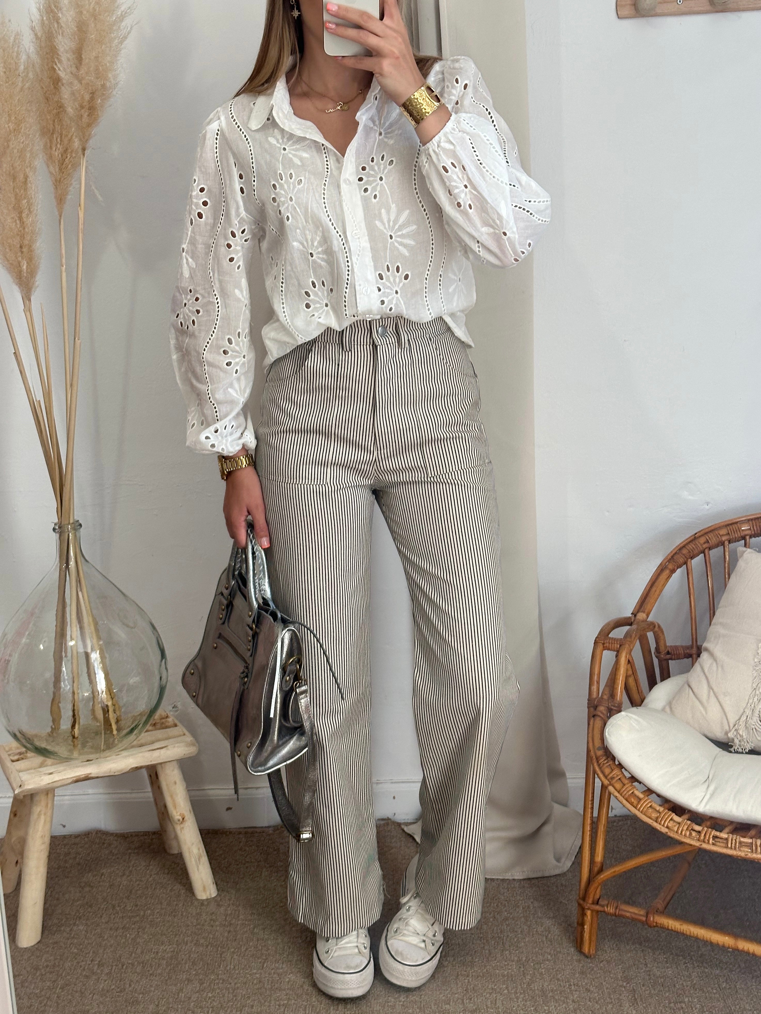 • pantalon à rayures bleu marine très foncé et blanc , taille haute