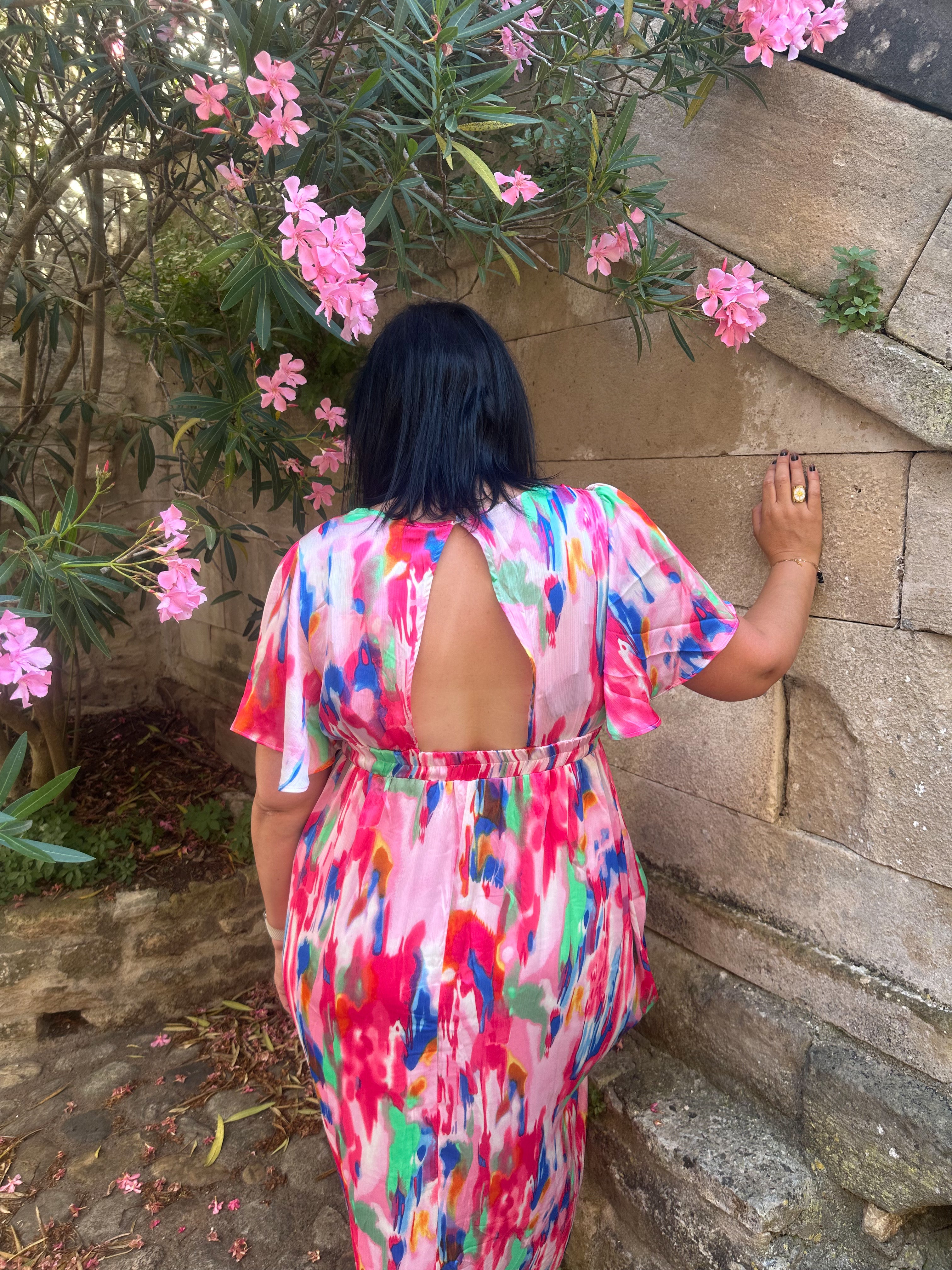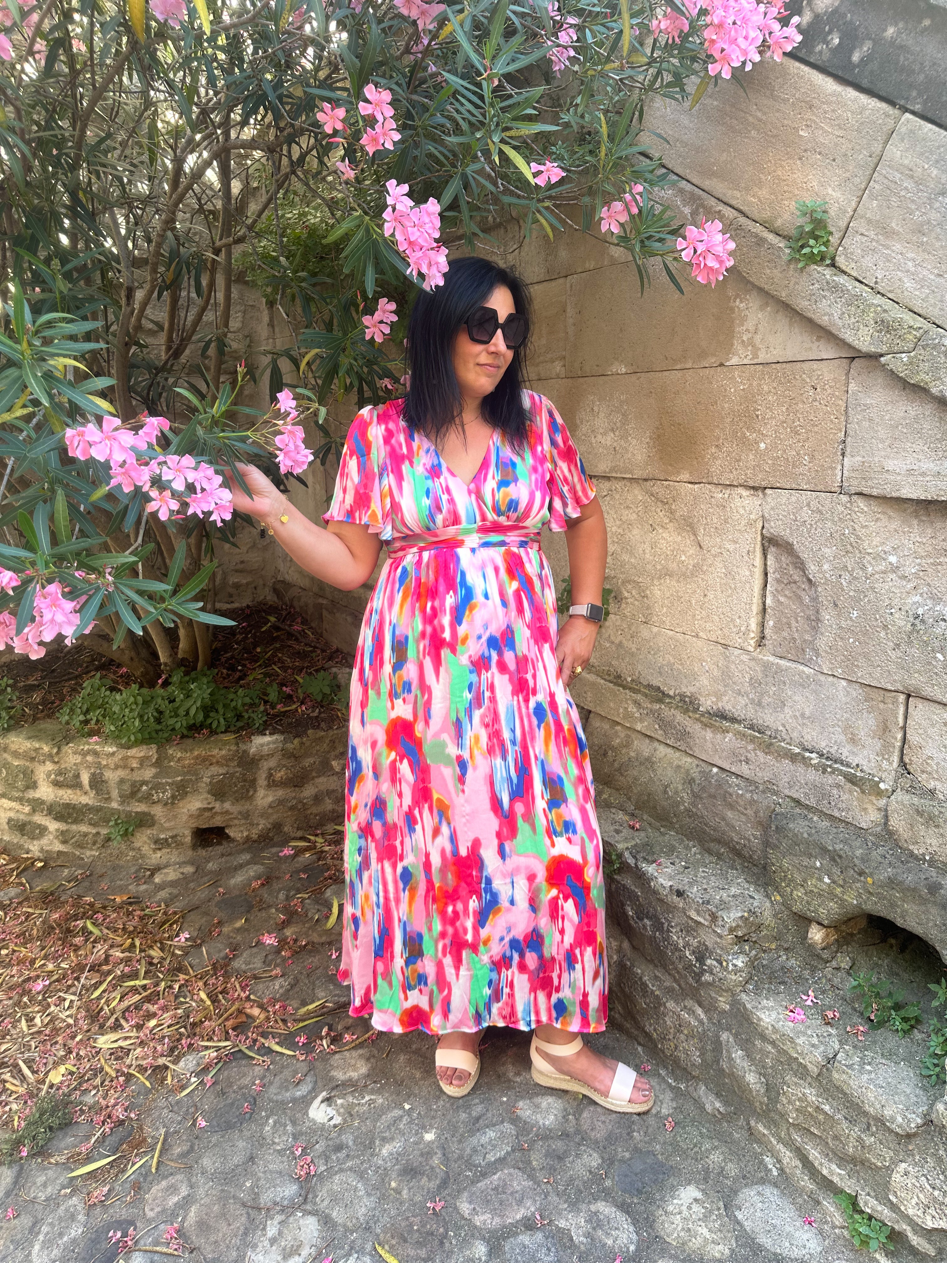 Le mannequin mesure 1m80. Elle porte une taille 44 pour le haut et une taille 48 pour le bas.